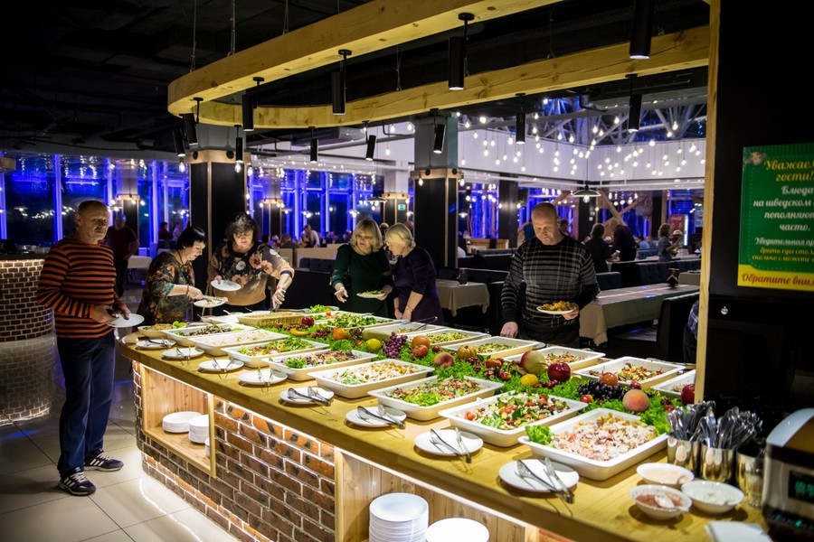 Для справки: Поход в кафе All inclusive обойдётся в 1 300 рублей с одного человека. В эту стоимость входит любая еда, напитки и развлекательная программа. В новогоднюю ночь вход будет стоить 2 300 рублей с человека. Но есть одно «но»: оставлять еду на столе после себя нельзя. Съедать нужно всё, что взяли, иначе «штраф» – 500 рублей. Так работает система шведского стола.