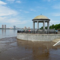 Вода в районе Благовещенска прибывает буквально на глазах. Нижний ярус набережной реки Амур уже полностью скрылся под водой.