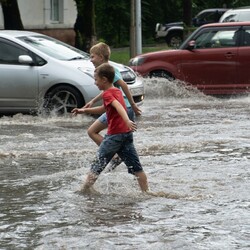 Если для автомобилистов затопленный участок – это повод снизить скорость или объехать его, то для детей это причина для радости.