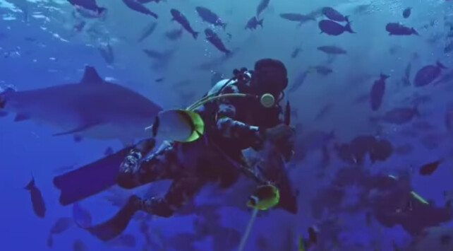 На видео мужчина плавает среди мелких рыб, когда к нему совсем близко подплыла акула. Покрутившись вокруг потенциальной жертвы, хищница уплыла.