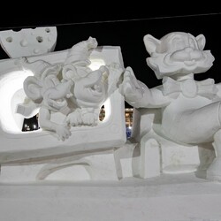 Городок и набережную города украсили почти три десятка снежных и ледовых фигур, включая горки, на тематику театра и мультфильмов.