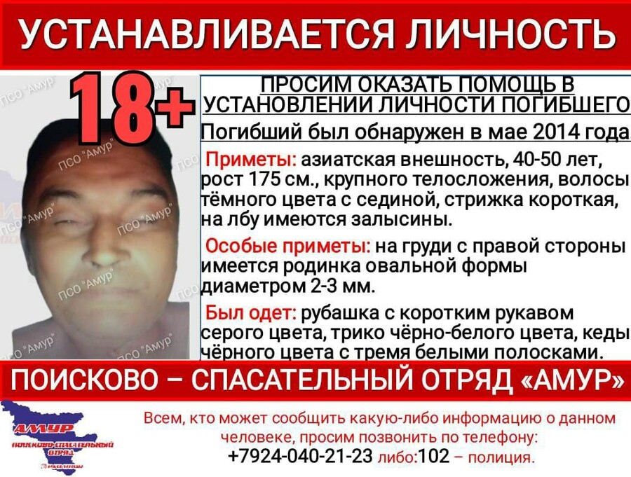 ПСО «Амур» просит оказать помощь в установлении личности погибшего человека. Его обнаружили в мае 2014 года на набережной реки Зея.