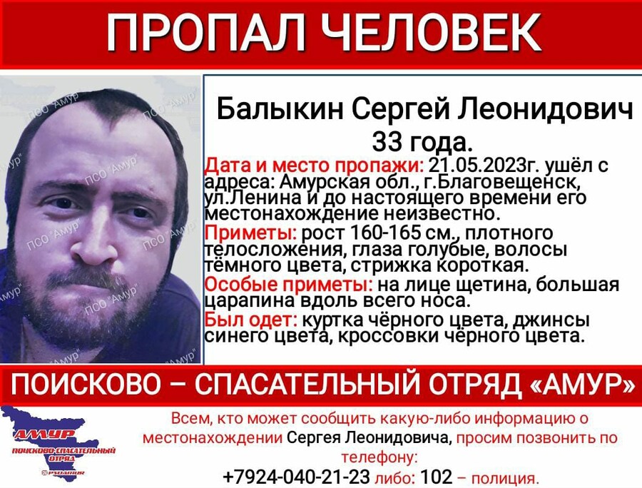 Всех, кто может сообщить какую-либо информацию о местонахождении Сергея Леонидовича, просят позвонить по телефонам: +7-924-040-21-33, либо 102-полиция.