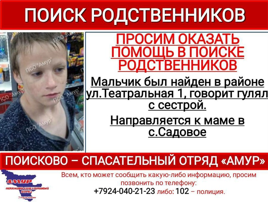 В амурской столице разыскивают родственников 8-летнего Никиты Побегайло. Мальчика нашли в районе Театральной, 1. Он объяснил, что гулял с сестрой, потерялся и решил самостоятельно отправиться к маме в село Садовое.