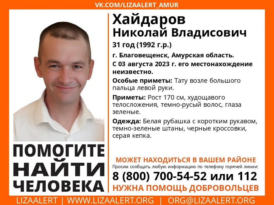 В областном центре разыскивают 31-летнего Николая Владисовича Хайдарова. О его местоположении неизвестно с 3 августа.