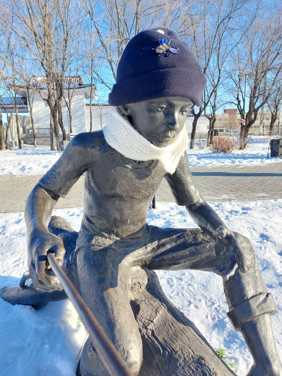Бронзовый мальчик-рыбачок, которые находится в парке Дружбы в микрорайоне Благовещенка, утеплился. Горожане надели ему шапку и шарфик.