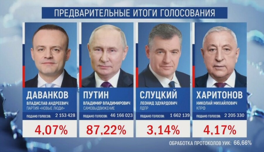 Кандидат в президенты РФ, действующий глава государства Владимир Путин лидирует на президентских выборах 2024 года, набирая 87 % по итогам обработки 60,01 % протоколов. Это следует из данных, опубликованных на информационном табло в ЦИК РФ.