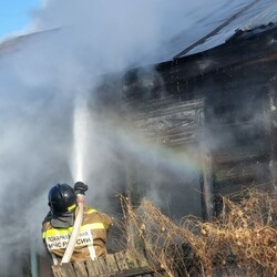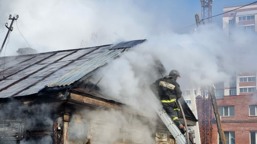 Спасателям удалось приблизиться к дому настолько, чтобы начать попытки попасть в горящий дом. К чердаку подставили лестницу. По ней забрался один из огнеборцев с пожарным рукавом и начал тушить строение сверху. И это несмотря на то, что его временами почти полностью окутывал едкий густой дым. Немного отдышавшись, он вновь возвращался к своей работе.