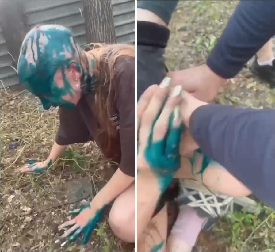 «Давай зеленку! Умывайся и проси прощения!» - командует мужчина, и девушке обильно поливают голову и лицо.