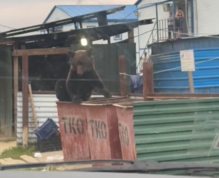 Прибывшие на место стражи порядка застали косолапого хищника, мирно сидящим в мусорном контейнере, пока беспечные жители вахтового городка снимали его на мобильные телефоны приблизившис на небезопасное расстояние.