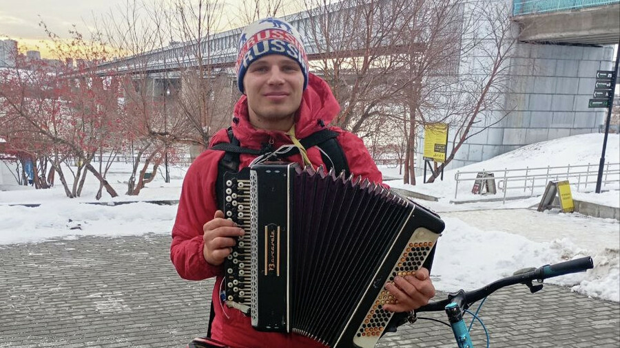 В минувшие выходные в Хабаровске музыкант-путешественник, исполняющий на велосипеде мантру «Харе Кришна» под баян, стал героем всех местных пабликов. Однако Хабаровск оказался не слишком приветливым: в итоге музыкант поскользнулся и порвал инструмент.