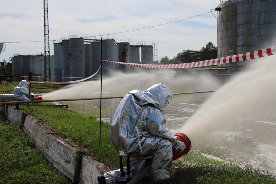 По сценарию, во время планового обхода территории станции машинист насосных установок обнаружил повреждение мазутного резервуара. Далее было оперативно проведено заседание комиссии по чрезвычайным ситуациям и запущен отработанный алгоритм действий по локализации и ликвидации разлива нефтепродуктов и устранению последствий.