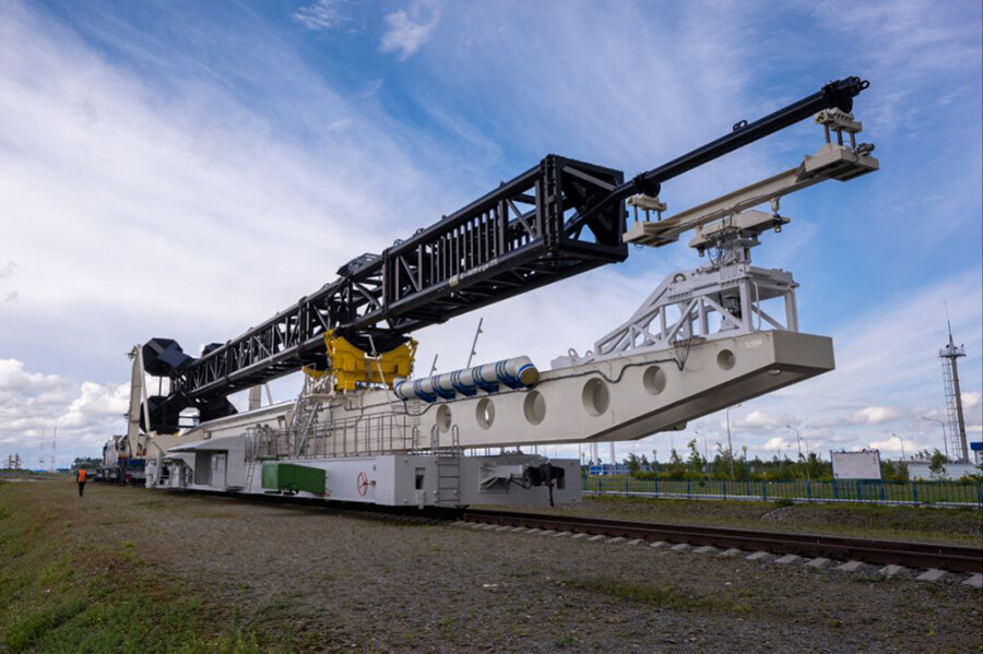 В монтажно-испытательном корпусе провели работы по перегрузке макета ракеты космического назначения в конфигурации с пилотируемым космическим кораблем, масса которого превышает 80 тонн, с опор хранения на транспортно-установочный агрегат и доставили его на стартовый комплекс.