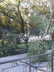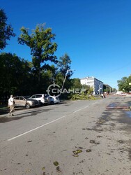 Кадры опубликовал телеграм-канал @Skaner28. К счастью, припаркованные рядом авто не пострадали. На кадрах видно, что дерево проломило забор и повалилось на проезжую часть. Ветви задели опору освещения, она накренилась.