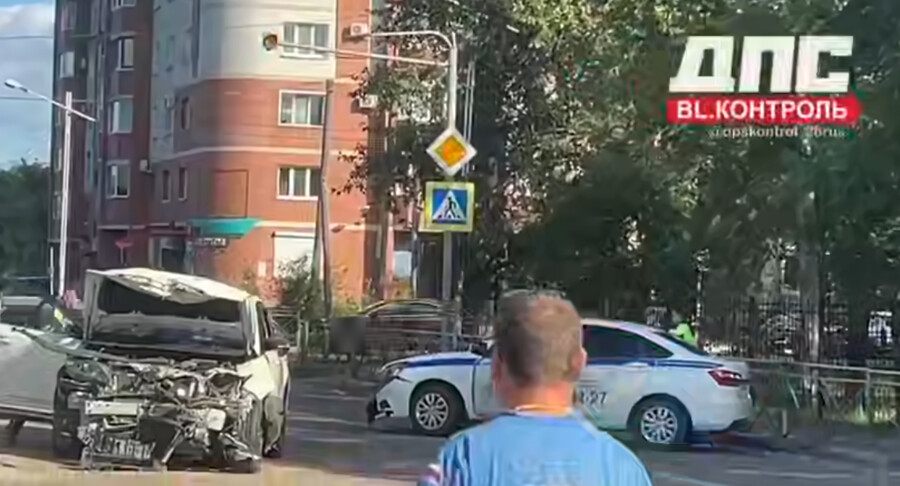 В Белогорске в субботу, 6 сентября, произошло странное ДТП. Водитель кроссовера въехал в припаркованный автомобиль, снес знак, а после, уезжая с места происшествия, протаранил проезжавший мимо автомобиль ГИБДД.