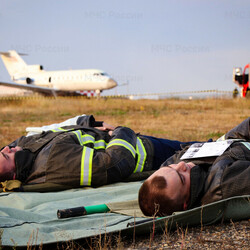 Следом на место «аварии» прибывает расчет здравпункта аэровокзала и начинает осмотр условно пострадавших. Расчеты центра транспортной и авиационной безопасности приступают к оцеплению места условного происшествия, выводу эвакуированных людей из опасной зоны и разграничению зон по указанию руководителя ликвидации последствий ЧС.