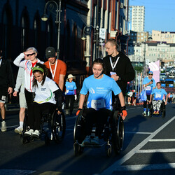 Первая дистанция, которой дали старт, был «Паралимпийский забег» на 500 метров. В 8:40 стартовали те, кто бежал полумарафон и марафон. Практически все участник надели кепки или солнцезащитные очки, так как в это время солнце светило прямо в лица участникам, но какого-то дискомфорта им это не доставляло. Пейзажи у всех бегунов были схожими: сопки и рельефы, стоящие на рейде корабли и два моста. Вот только те, кто бежал 28 километров, разворачивались сразу после того, как ступали на остров.