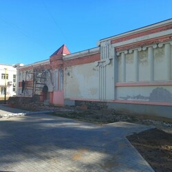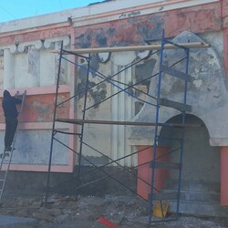Рабочие реставрируют стену, около которой расположен сквер. Что на ней будет изображено, пока непонятно.