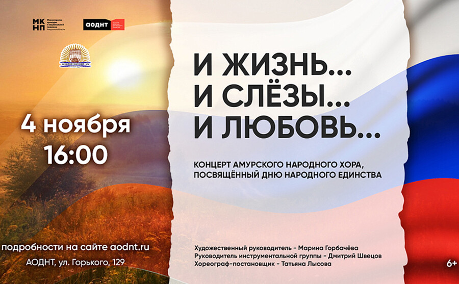 В праздничный день 4 ноября один из известнейших хоровых коллективов Амурской области выступит в областном Доме народного творчества (ул. Горького, 129). В 16:00 на сцене АОДНТ начнется концерт «И жизнь… И слёзы… И любовь…» (6+).