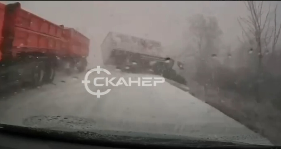 В момент ДТП идет снег. Автомобили едут медленно. Авто, видеорегистратор которого снял момент аварии, следует за рефрижератором.
