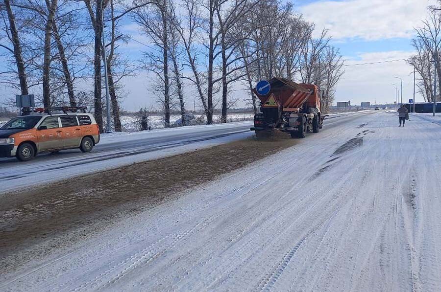 На трассах ведется очистка проезжей части от снега. Дороги обрабатывают противогололедными материалами. В ближайшее время, по мере действия реагентов, проезд станет более безопасным. Также расчищают остановки и подъезды к ним.
