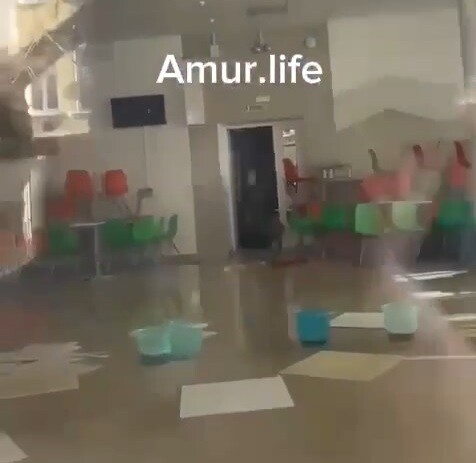 В первой гимназии Благовещенска произошла коммунальная авария. Судя по кадрам, которые сняли школьники, прямо с потолка столовой учебного заведения лилась вода.