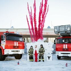 Местом действия стала пожарная часть, а главными атрибутами – две пожарные машины, боевая одежда, огнетушители и специальный дымный фейерверк.