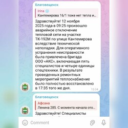 12 ноября благовещенцы снова написали в чат-бот мэра и получили ответ: глава города объяснил, что в связи с затопленными проходными галереями снижены параметры теплоносителя и давление. Работы выполнили специалисты АКС и завершили их в день отключения к вечеру.