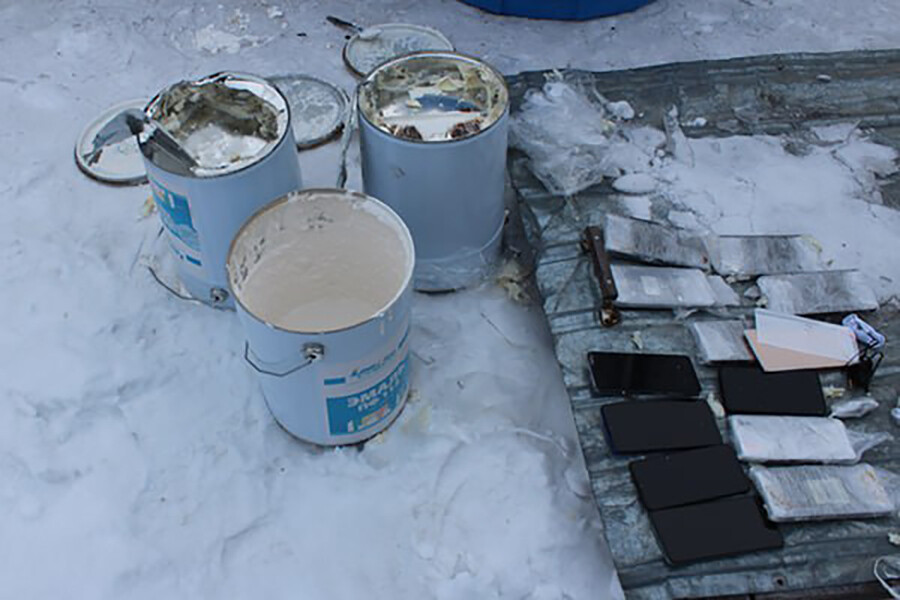 Оказалось, что свыше десятка телефонов, 16 наушников и около 30 сим-карт были спрятаны в банках с краской, имеющих двойное дно.
