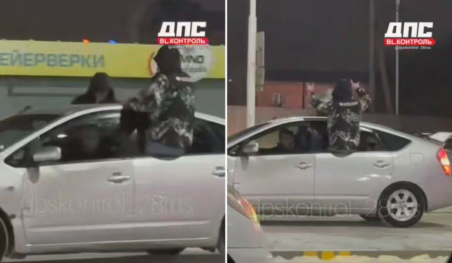 Видео было снято в темное время суток. На кадрах, которые разместил телеграм-канал @dpskontrol_28rus, видно, что автомобиль, полный людей, совершает резкие маневры на льду.