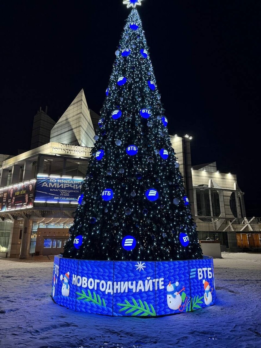 На площади Общественного культурного центра в Благовещенске установлена новогодняя ёлка от ВТБ. Она уже стала центром притяжения для жителей и гостей города в преддверии зимних праздников. 12-метровую ель украшают 540 шаров и 300 метров гирлянд, а ее основание декорировано с отсылкой к общероссийской кампании банка «Новогодничайте».