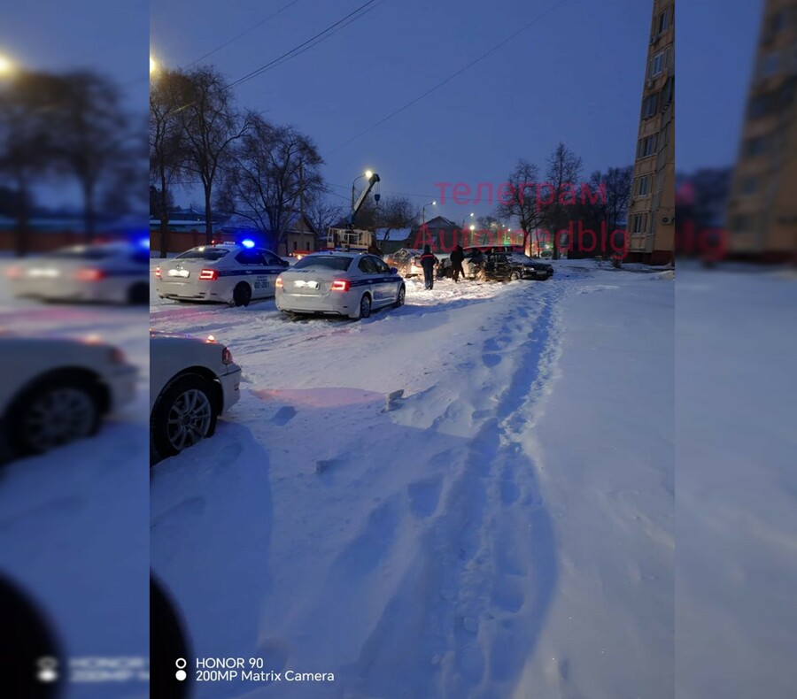 Судя по фото, присланному очевидцами, ДТП произошло на заснеженной дороге. На месте работают несколько патрулей ГАИ.