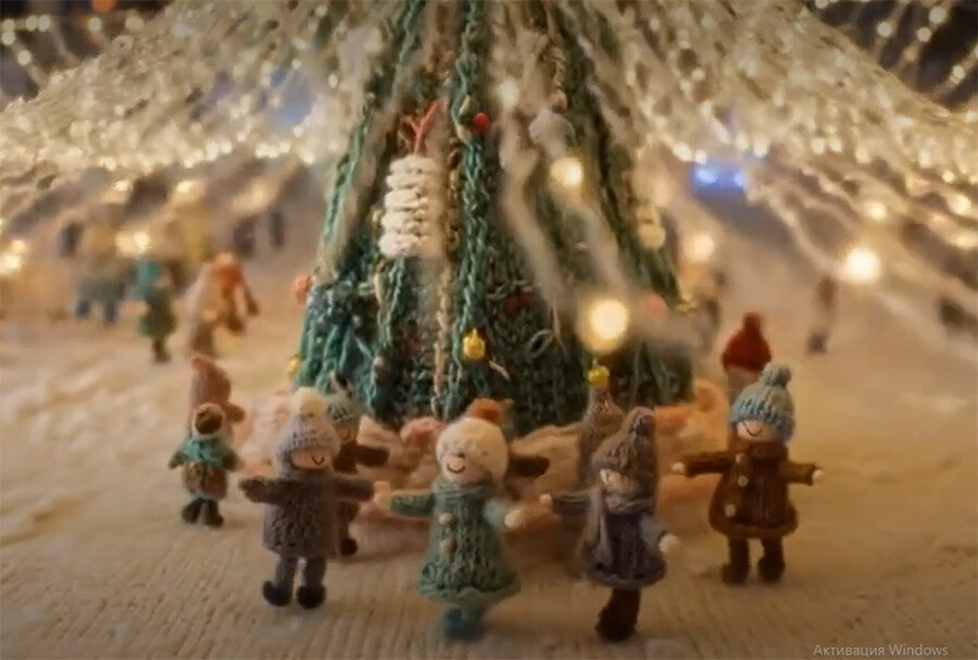 Сначала на площади Свободного вязаные жители радостно пляшут под вязаной празднично украшенной елкой. Затем вязаные человечки на железнодорожном вокзале встречают вязаный поезд Победы с красной звездой.