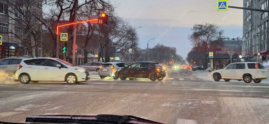 В Благовещенске ранним утром 10 декабря случилось ДТП на перекрестке улиц Калинина и Амурской. Столкнулись два автомобиля.