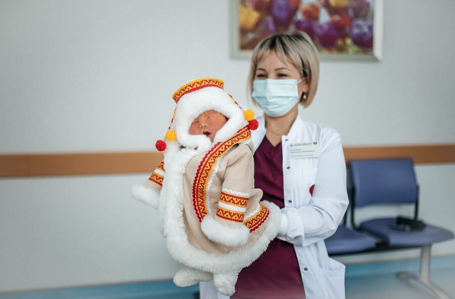В перинатальном центре Ноябрьска 10 декабря в честь 95-летия округа малышей выписывали в национальных костюмах коренных народов Севера. Наряды новорожденным шьют сотрудники больницы.