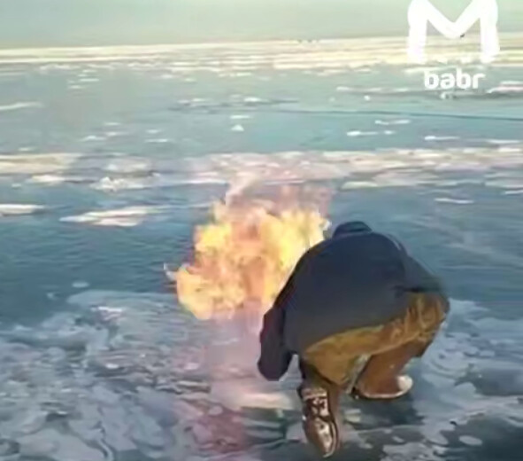 В соцсетях распространяется ролик, на котором мужчины поджигают что-то на льду Байкала. Поясняется, что это горит метан, который поднялся со дна озера.