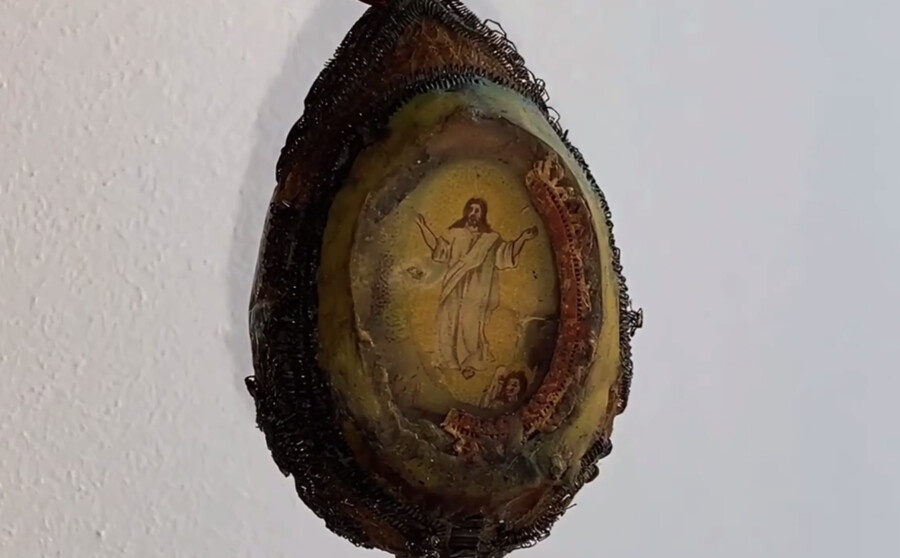 «Игрушка овальной формы 6,5 на 4 сантиметра. Материалами для её изготовления послужили дерево, проволока, нитки, стекло, бумага и воск. На стеклянной крышке четко прослеживается изображение Бога и двух ангелов», - рассказали в музее.