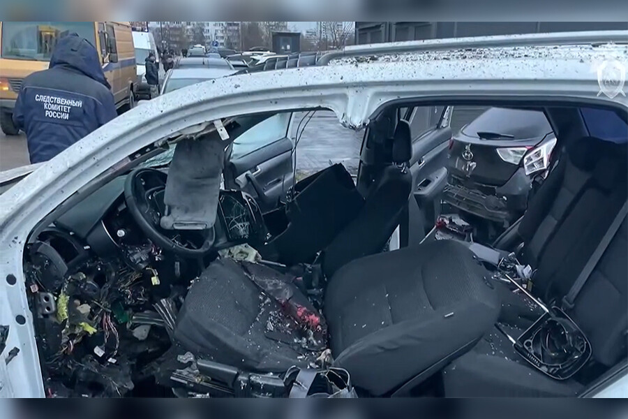 Следком РФ в своем Telegram-канале показал кадры с места убийства генерала Фанила Сарварова на юге Москвы. Автомобиль сильно поврежден взрывом и внутри, и снаружи.