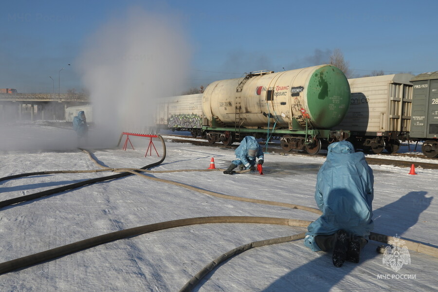 На железнодорожном вокзале Благовещенска прошли пожарно-тактические учения, в ходе которых подразделения отрабатывали две вводные: тушили пожар и разбирали обрушившиеся конструкции в административном здании вокзала, а также ликвидировали последствия ЧС при разгерметизации цистерны с аммиаком.