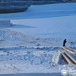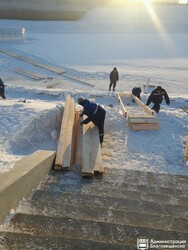 В Благовещенске на «Серебряной миле» продолжают готовить купель к массовому посещению. Для безопасного спуска и подхода к проруби здесь соорудили длинный деревянный настил.