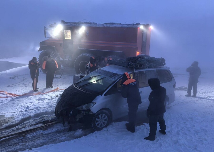 Как рассказали спасатели в своем телеграм-канале, в 8:00 на номер 112 поступило сообщение о том, что в районе Даркылаха затонула машина с людьми. Позвонил один из пострадавших, которому удалось выплыть из полыньи и добежать до ближайших домов.