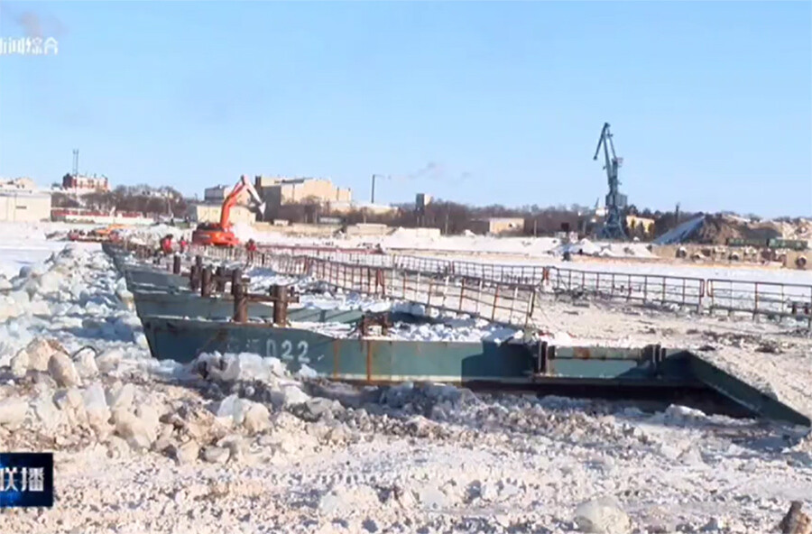 Как говорится в сюжете, 27 декабря китайская сторона на своей стороне установила 13 понтонов, что соответствует 260 метрам моста. Российская сторона завершила установку 5 понтонов, что соответствует 284 метрам. По середине реки, между двумя сторонами также установлено 5 понтонов, что соответствует 100 метрам переправы.