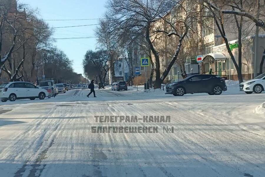 «В тему неочищенных дорог. А так выглядит участок Амурской — между Трудовой и вплоть до 50 лет Октября. Трудовая, Шимановского, Островского, Красноармейская выглядят аналогично – лед, бугры. Навалы на перекрестках, где "зебры" высотой до колен. Самый центр города», – пишет Telegram-канал Благовещенск № 1.