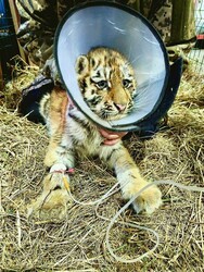 Спустя две недели под присмотром врачей найденыш чувствует себя лучше. Она исправно принимает пищу, пьет и даже временами проявляет свой тигриный характер. По чуть-чуть набирает вес.