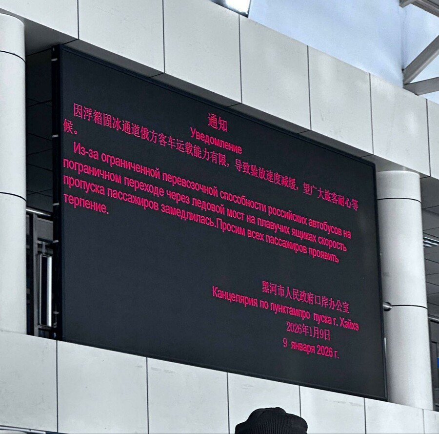 «Из-за ограничений перевозочной способности российских автобусов на пограничном переходе через ледовый мост на плавучих ящиках (понтонный мост – прим.ред.) скорость пропуска пассажиров замедлилась. Просим всех пассажиров проявлять терпение», – цитирует Biang.ru русскоязычное объявление в здании таможни Хэйхэ.