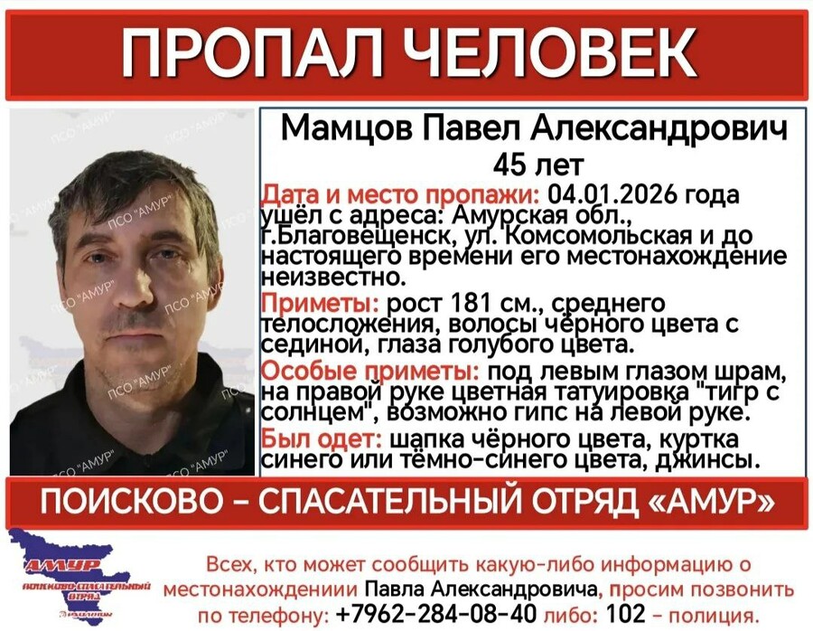 Всех, кто может сообщить какую-либо информацию о местонахождении Павла Мамцова, просят позвонить по телефонам: +7962-284-08-40, 102 полиция.