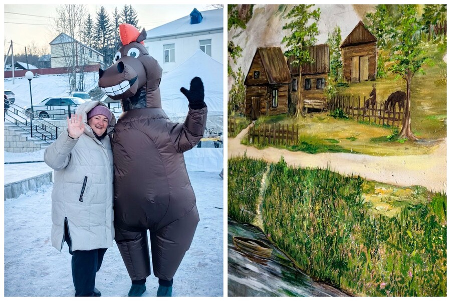 На стенах подъезда – северные пейзажи, домики на берегу реки и пасущиеся олени.