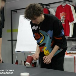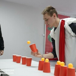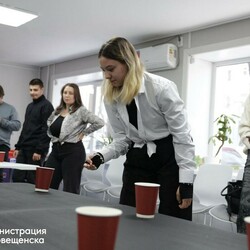 Участники турнира по тусологии справлялись с неожиданными заданиями: строили башни из пластиковых стаканчиков на скорость, старались перенести конфеты, аккуратно раскручивая их в бокале. Испытания проверяли не только ловкость и реакцию, но и учили договариваться, поддерживать товарищей по команде и не терять чувство юмора.
