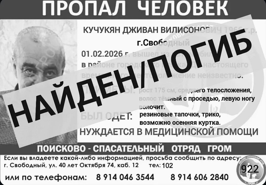 В Свободном найден погибшим местный житель, который с воскресенья, 1 февраля, числился пропавшим без вести. Тело мужчины было найдено только во вторник, 3 числа.
