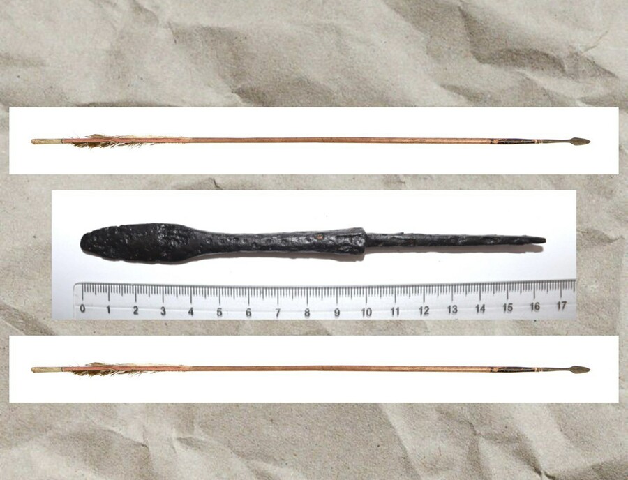 Наконечник выполнен кузнечным способом из железа. Отличается вытянутым гранёным лезвием, острым с обеих сторон и закрепленным на длинном узком цилиндрическом стержне.